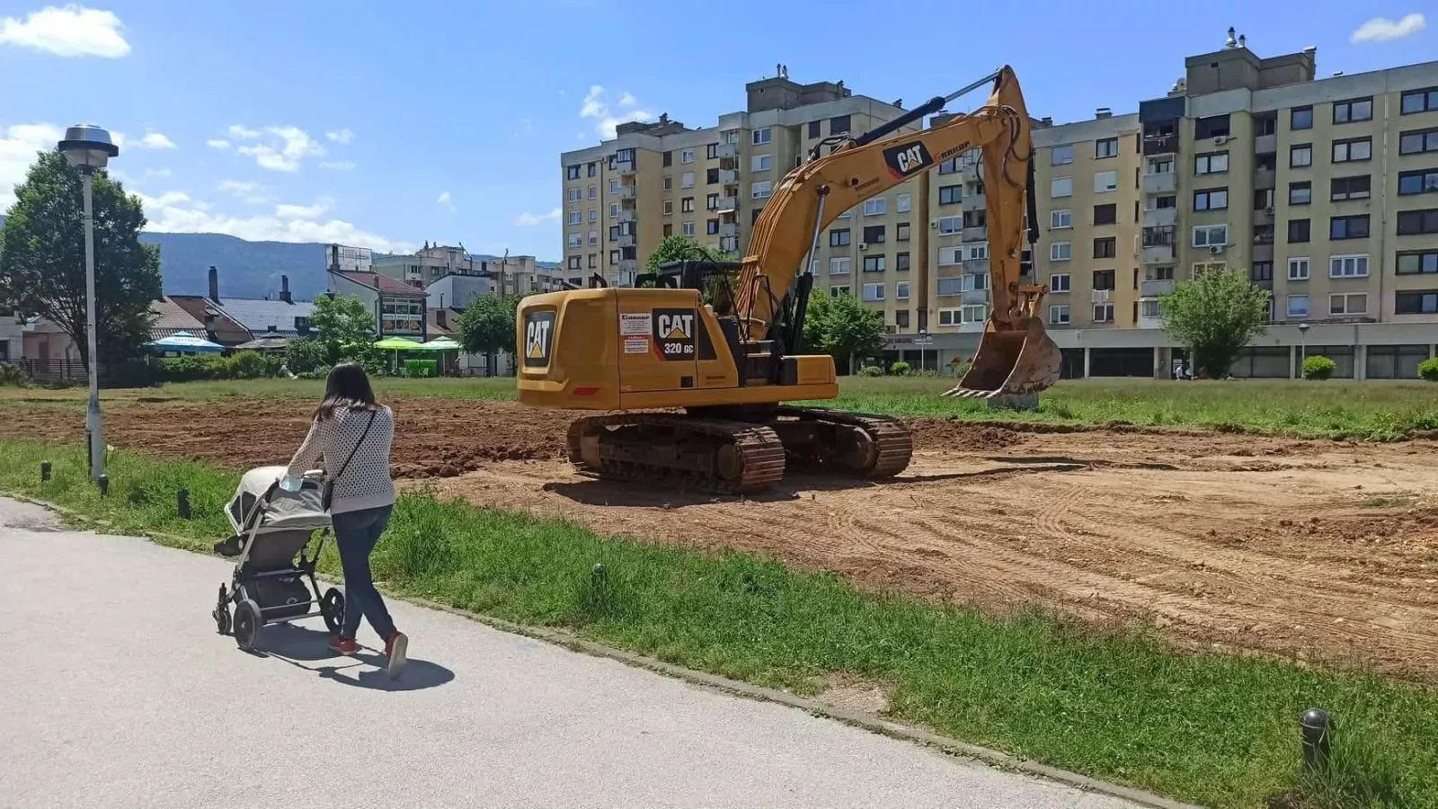 Na travnjaku je ostala jedna građevinska mašina koja teren nakon započetih radova vraća u prvobitno stanje. Kamionima se dovozi zemlja s Kobiljače kako bi se teren izravnao.