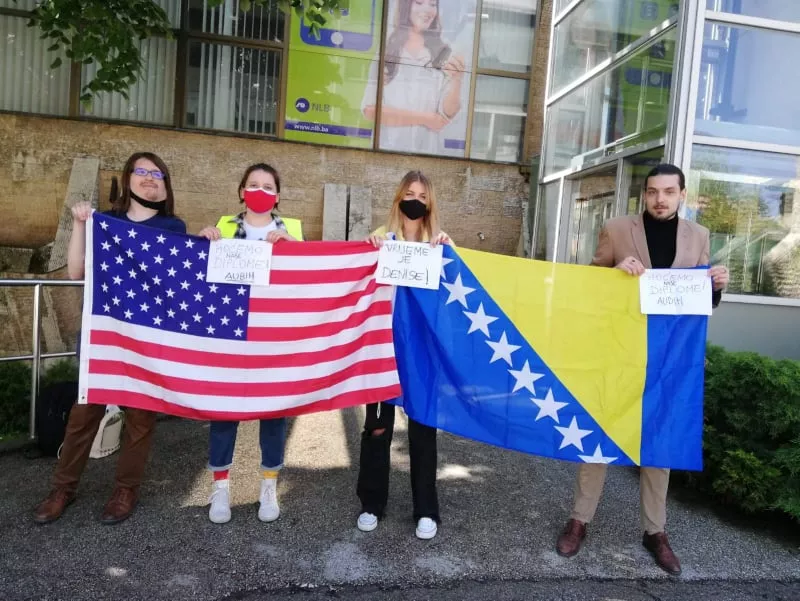 Studenti su danas simbolično držali u rukama zastave BiH i SAD i poruke: Vrijeme je Denis, Hoćemo diplome AUBiH.