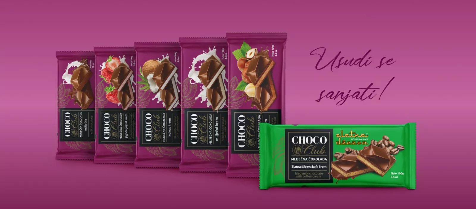 SARAJEVO, (Patria) - „Usudite se sanjati, jer mi jesmo!“, poručili su iz kompanije Vispak d.d. uspješno obilježivši lansiranje novih čokolada pod brendom Choco Club. Riječ je o liniji novih proizvoda, čokolada vrhunskog kvaliteta i osvježenog dizajna u gramaži 80-100g, koje u asortimanu nude Mliječnu tablu, Mliječni krem, Kokos krem, Lješnjak krem, Jagoda – jogurt krem i inovativni okus Zlatna džezva – kafa krem.