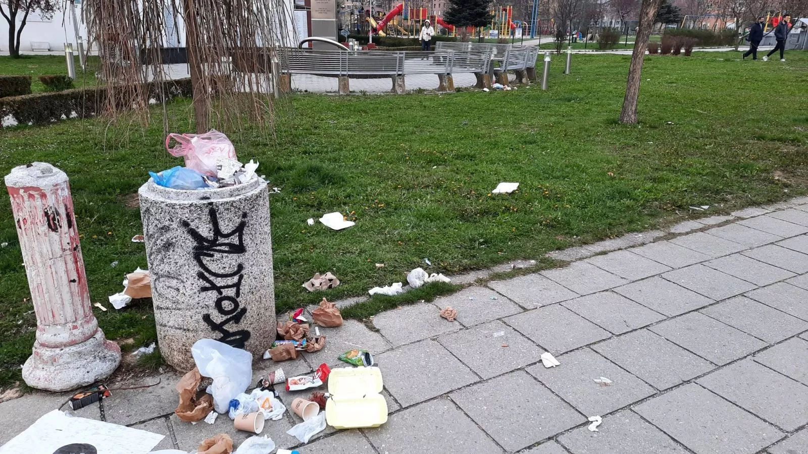 Smeće je čak ostavljeno i na klupama u centralnoj šetačkoj zoni pa tako da i oni koji bi htjeli sjesti prvo moraju pokupiti smeće koje nemaju gdje baciti. Dodatni problem je što se oko kanti za otpatke okupljaju vrane koje raskopavaju smeće i raznose ga.