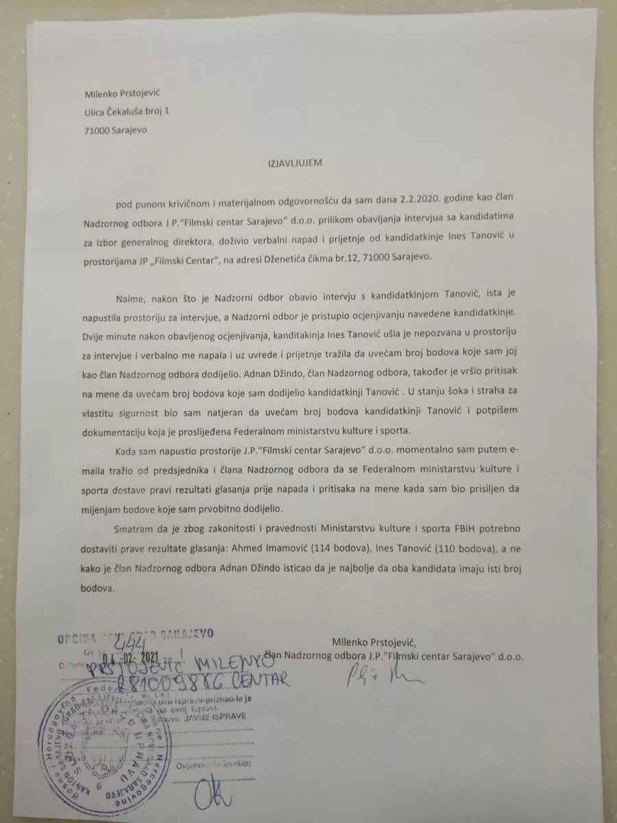 SARAJEVO, (Patria) -Na skandalozne materijale koji pokazuju kako se namještao konkurs za Imenovanje direktora Filmskog centra u Sarajevu još niko nije reagovao. Za direktora bi prema datoj saglasnosti na sjednici Vlade FBiH trebala biti imenovana aktuelna v.d direktorica Ines Tanović koja se za to izborila pritiscima i napadom na srpskog člana Nadzornog odbora Filmskog centra.
