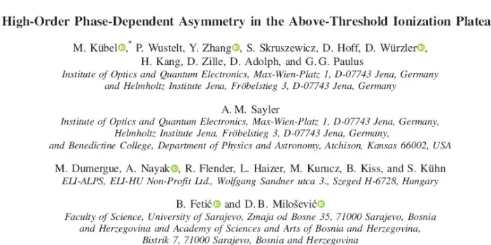 (Patria) - Danas 17. marta 2021. godine rad “High-order phase-dependent asymmetry in the above-threshold ionization plateau“ („Fazno-zavisna asimetrija više reda u platou jonizacije iznad praga“, https://link.aps.org/doi/10.1103/PhysRevLett.126.113201), čiji su koautori doc. dr. Benjamin Fetić i akademik prof. dr. Dejan Milošević sa Odsjeka za fiziku Prirodno-matematičkog fakulteta Univerziteta u Sarajevu, objavljen je američkom časopisu Physical Review Letters, najboljem časopisu iz fizike u kojem se objavljuju kratki radovi (Letters; impact factor 8,385). Objavljeni rad je rezultat saradnje naših naučnika sa dvije eksperimentalne naučnoistraživačke grupe, iz Jene, Njemačka, i iz Segedina, Mađarska.