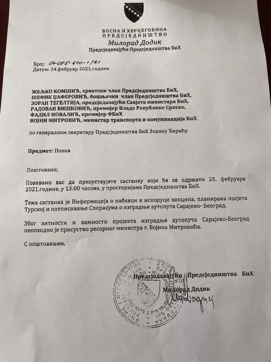 To je vidljivo iz poziva Milorada Dodika, člana Predsjedništva BiH koji je na sastanak pozvao i Vojina Mitrovića, ministra prometa i komunikacija BiH.