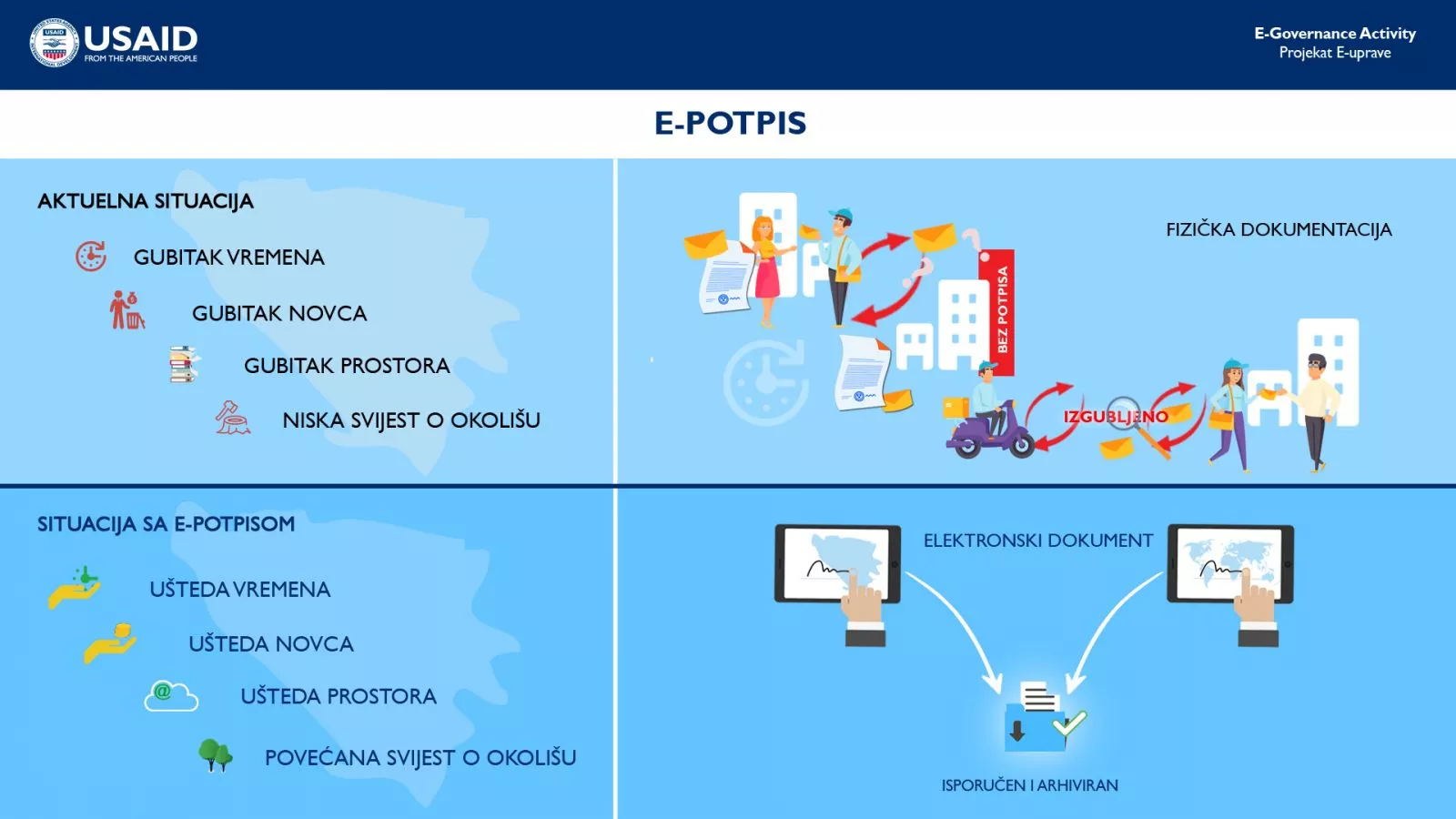 USAID-ov projekat E-uprava će obizbijediti softvers, hardver i tehničku pomoć za e-potpise, e-građevinske dozvole, inspekcijske službe, socijalne registara i procese javnih nabavki širom BiH. Poboljšana i efikasna administracije imati će neposredan, pozitivan utjecaj na građane i preduzeća u BiH.