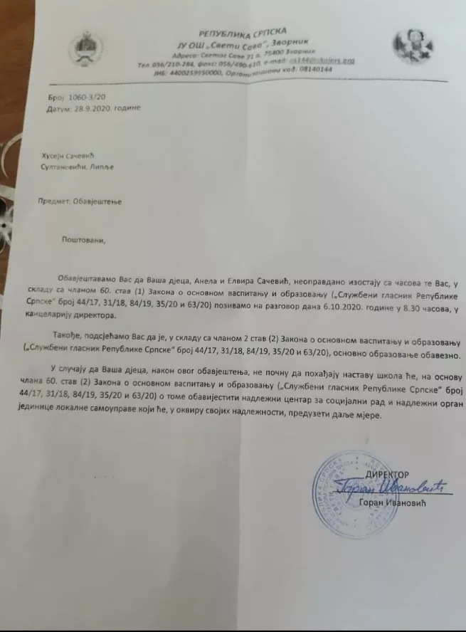 „Obavještavamo vas da vaša djeca Anela i Elvira Sačević neopravdano izostaju sa časova te vas pozivamo na razgovor dan 6.10.2020. godine u kancelariju direktora. Podsjećam vas da je osnovno obrazovanje obavezno. U slučaju da vaša djeca nakon ovog obavještenja ne počnu da pohađaju nastavu škola će o tome obavijestiti nadležni centar za socijalni rad i nadležni organ jedinice lokalne samouprave koji će u okviru svojih nadležnosti preduzeti dalje mjere“, navodi se u dopisu direktora.