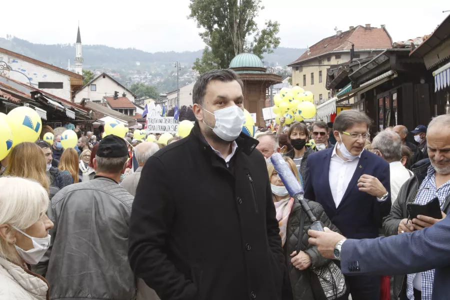 „S obzirom da mi radimo i stateški planiramo način reakcije ukoliko SDA sa partnerima satelitima SBB-om i DF-om i partnerima novim na nivou države opozicijom iz RS-a krene u ovo vrlo zabrinjavajuće odgađanje izbora ovo je prvi u nizu protesta koje ćete gledati u BiH, gledate ćete ih u cijeloj državi. Cijenimo poziv gospodina Hadžikadić i rado smo se odazvali pozivu“, kazao je Konaković.