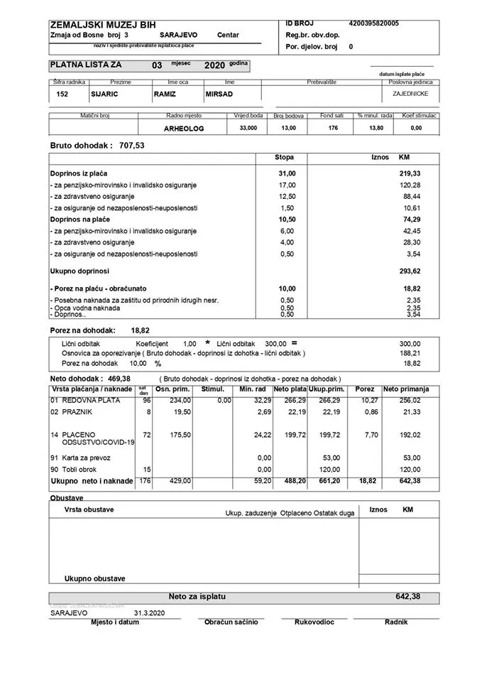 "Pod ovogodišnjim sloganom DNM 2020 "Muzej za jednakost, različitost i uključivost" iz Zemaljskog muzeja BiH javno objavljujemo platnu listu za mjesec mart 2020. direktora Zemaljskog muzeja BiH dr. sci. Mirsada Sijarića ujedno i muzejskog savjetnika za kasni srednji vijek. Iz priloženog se može vidjeti da direktorska plata "državnog" muzeja iznosi 642,38 KM neto, uz napomenu da ista neće biti uplaćena do daljnjeg. Nakon svih do sada poznatih i javno objavljenih problema u kojima se nalazi Zemaljski muzej Bosne i Hercegovine iz istog muzeja pitamo se: Da li je državi Bosni i Hercegovini potreban državni muzej?", navode iz Zemaljskog muzeja BiH.