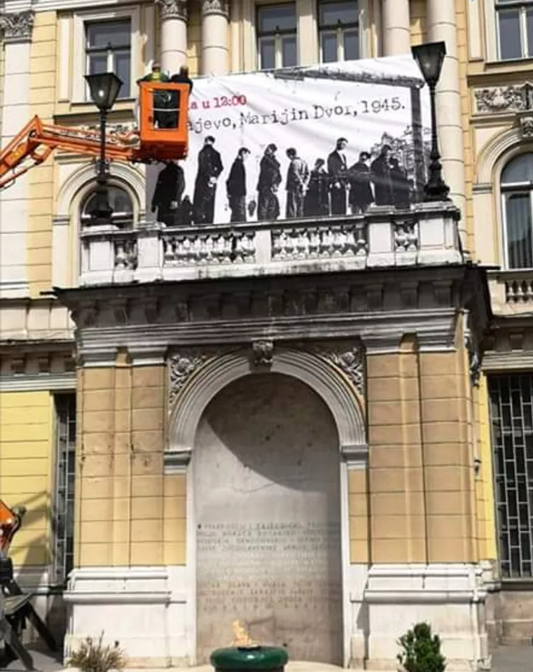 SARAJEVO, (Patria) - Na zgradi kod Vječne vatre postavljena je slika stradanja građana Sarajeva fašističkog terora 1941-1945 režima NDH kada je samo krajem marta 1945. godine 55 osoba obješeno na Marijin Dvoru. Fotografije je izradio i postavio Savez antifašista i boraca Narodnooslobodilačkog rata (SABNOR) koji i sutra u subotu 16. maja organizira komemorativni mimohod i okupljanje antifašista kako bi se obilježilo 75 godina od pada tog zloglasnog režima.