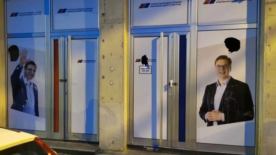 Prenijete su fotografije na kojima se vidi da su razbijena stakla izloga s fotografijama predsjednika SNS i Srbije Aleksanda Vučića.