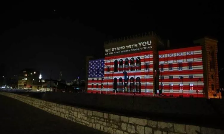 Sarajevska Vijećnica večeras je osvijetljena u bojama američke zastave sa porukom solidarnosti i podrške u ovim izazovnim vremenima.