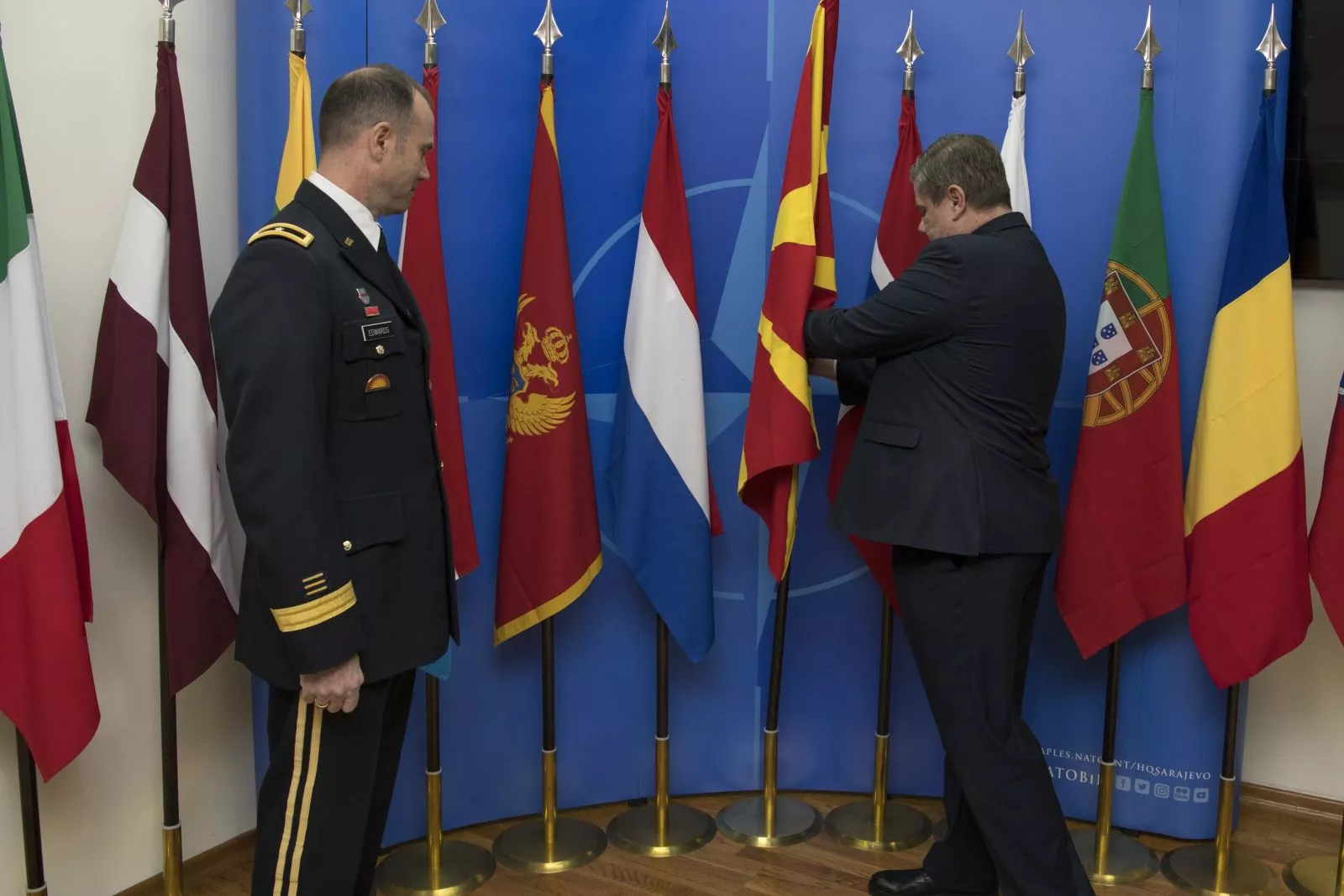 Zamjenik šefa misije ambasade Sjeverne Makedonije u BiH Riste Velkovski je sa brigadnim generalom Williamom Edwardsom, komandantom NATO Štaba Sarajevo postavio zastavu Sjeverne Makedonije u zgradi komande NATO Štaba Sarajevo na mjesto gdje se nalaze i zastave drugih članica.