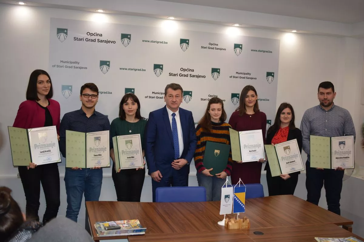 SARAJEVO, (Patria) - Načelnik Općine Stari Grad mr Ibrahim Hadžibajrić ugostio je danas najbolje studente iz ove općine, dobitnike zlatnih i srebrenih znački Univerziteta u Sarajevu u akademskoj 2019/20. godini. Sedam studenata Filozofskog, Pedagoškog, Elektrotehničkog, Ekonomskog i Prirodno-matematičkog fakulteta nagrađeni su za svoj trud, rad i postignuti uspjeh, a ohrabruje činjenica da neki od njih već stiču i prva radna iskustva. O odlasku iz Bosne i Hercegovine ne razmišljaju, što su potvrdili i tokom današnjeg prijema.