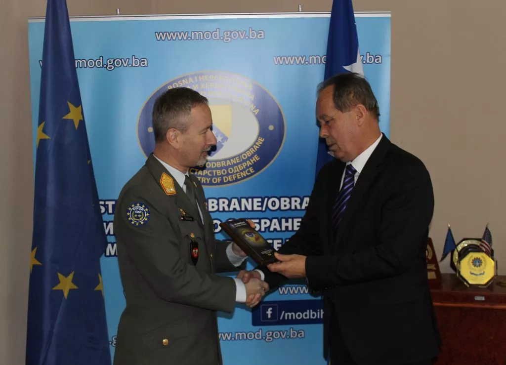 Ministar Podžić je na početku sastanka uputio riječi dobrodošlice generalu Trischaku i zahvalio se na doprinosu EUFOR-a u izgradnji mira i u razvoju operativnih sposobnosti OS BiH. Ministar