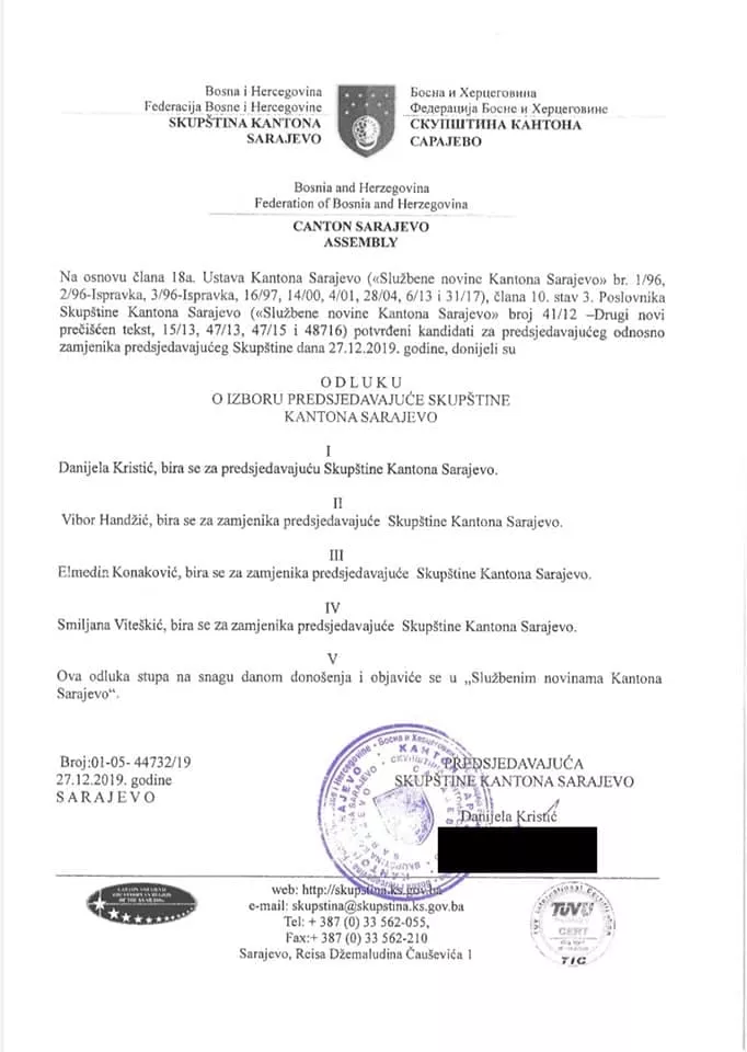 Danijela Kristić iz Naroda i pravde nakon povlačenja Elmedina Konakovića izabrana je za predsjedavajuću Skupštine Kantona Sarajevo. Zvanični dokument sa pečatom objavila je na Facebook profilu.