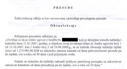 „Po toj presudi na koju se banka žalila višem Kantonalnom sudu u Mostaru gdje im je žalba odbijena pravosnažno je utvrđeno da je ugovor ništavan te da H/Addiko banka mora vratiti 1.275.981,00 KM, da je valutna CHF klauzula nezakonita i da banka mora sve isplatiti po vise obračunatom kursu u odnosu na dan podizanja kredita, na osnovu nezakonite valutne klauzule banka mora vratiti 706.980,79 KM, da banka mora vratiti sve po više obračunatim kamatama u iznosu od 239.751,56 KM, da H/Addiko banka mora platiti i sudske troškove u iznosu od 13.968,30 KM i sve to i sve to sa zakonskom zateznom kamatom od dana tužbe 22.10. 2013., pa do isplate“, stoji u presudi.