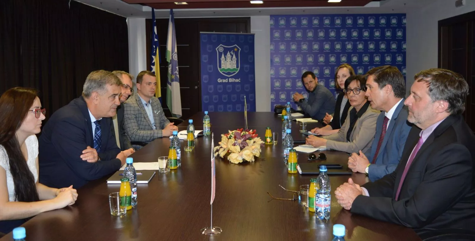 BIHAĆ, (Patria) - Šuhret Fazlić, gradonačelnik Bihaća zajedno sa Davorom Župom, predsjedavajućim Gradskkog vijeća Bihać, Arminom Amidžićem, v.d. direktora TZ Bihać i Ildom Alibegović, zastupnikom u Skupštini USK-a, ugostio je danas Erica Nelsona, ambasadora SAD-a u BiH i Matthewa Palmera, zamjenika pomoćnika državnog sekretara SAD-a.