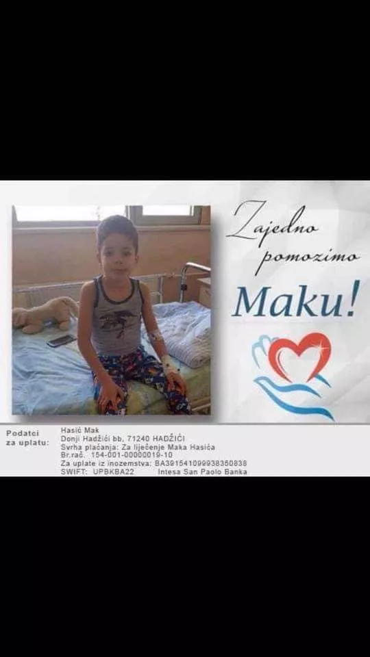 (Patria) - Sedmogodišnjem Maku Hasiću potrebna je pomoć dobrih ljudi kako bi pobijedio tešku i opasnu bolest. Krajem marta sedmogodišnjem Maku Hasiću dijagnosticiran je rijedak i agresivan oblik ne-Hodgkinovog limfoma pod nazivom Burkittov limfom, visokog stepena malignosti.