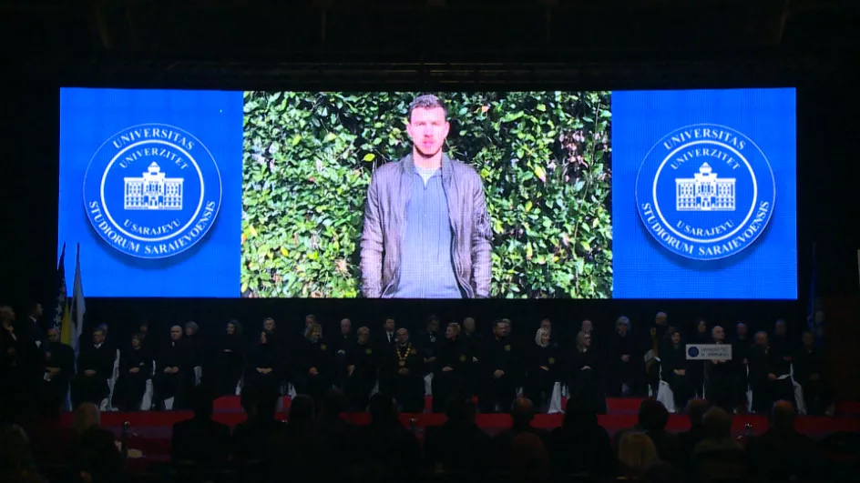 Iznenađenje za mnoge prisutne, pa i za brojne dekane bilo je obraćanje Edina Džeke, poznatog bh. nogometaša. Dobitnik je diplome Fakulteta sporta i tjelesnog odgoja. U kratkoj video poruci Džeko je poručio da studenti trebaju izabrati Sarajevski univerzitet. Ta Džekina poruka valjda je trebala poslužiti za promociju Univerziteta i pokazati uspješnu politiku rektora. Nažalost, otkrila je svu njegovu trulež.
