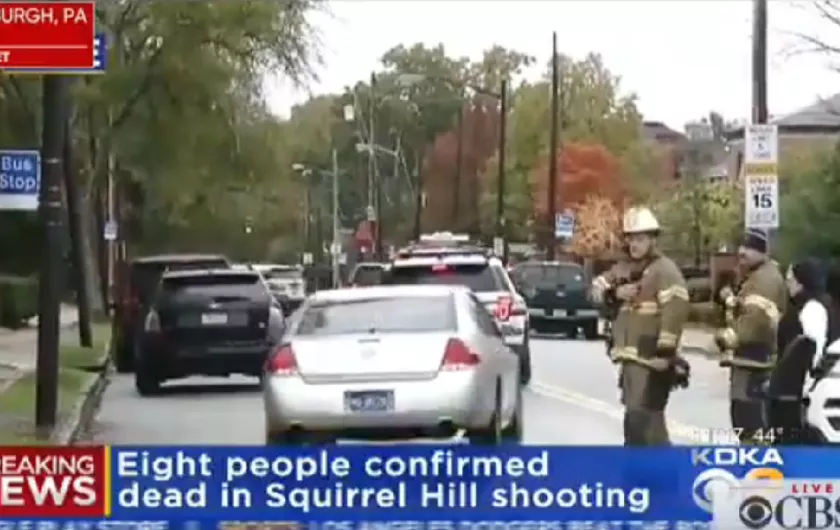 Na televizijskom snimku se vidjela policija koja stoji ispred sinagoge Drvo života, koja na internetskoj stranici opisuje sebe kao tradicionalnu, progresivnu i egalitarnu zajednicu.
