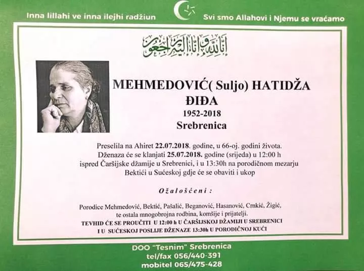 U 11 sati 25. jula bit će održana komemoracija u Velikoj Sali Kulturnog centra u Srebrenici. Hatidža je preminula nakon 23 godine ustrajne borbe za istinom o ubistvu srebreničkih sinova i privođenju pravdi njihovih ubica. Tužna vijest o njenoj smrti je iznenadila i potresla sve one koji su je poznavali, a naročito one koji su joj bili podrška u borbi za istinu i pravdu. Iz njenih usta nikada nije potekla riječ mržnje.