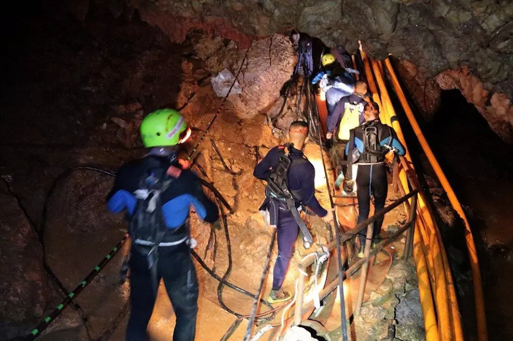 Grupa dječaka u dobi od 11 do 16 godina i njihov 25-godišnji trener u špilji su od 23. juna, kad su snažne oborinske vode zatvorile put do izlaza iz špilje. Spasilački tim čini 90 ronilaca, od kojih je 50 stranaca, a 40 Tajlanđana.