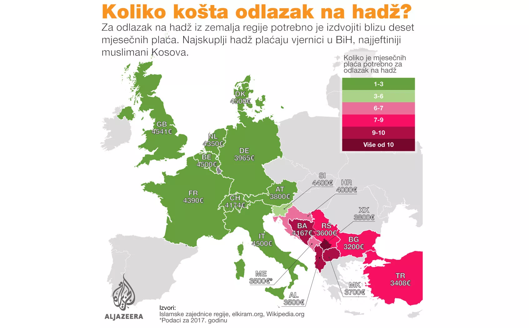 Muslimanski vjernici iz zemalja bivše Jugoslavije trebaju izdvojiti nekoliko mjesečnih plaća za putovanje na hadž. Stanovnicima Kosova potrebno je 10,2 prosječnih plaća. Vjernicima iz Albanije, Makedonije i BiH za hadž treba više od devet mjesečnih plaća.