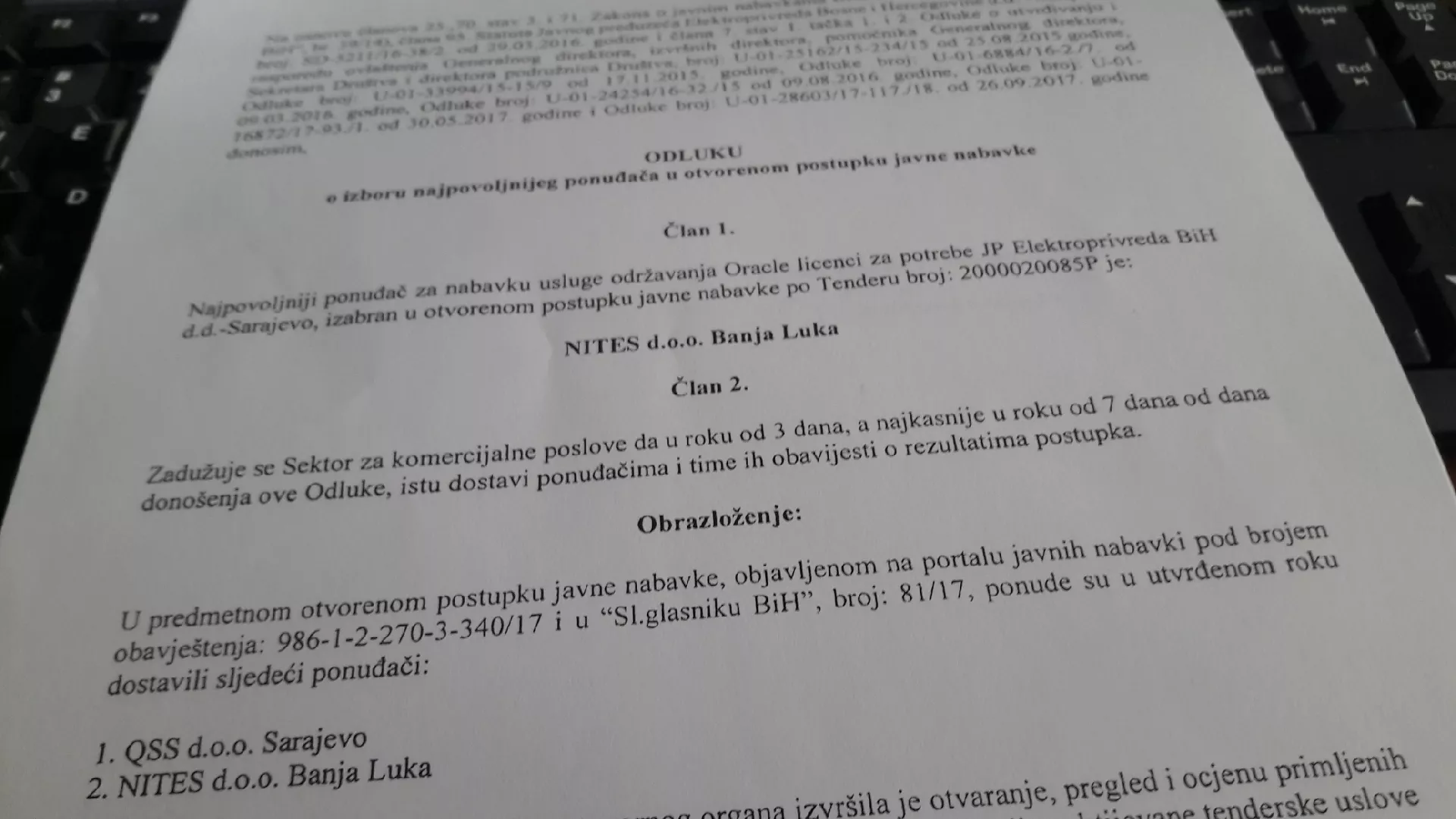 SARAJEVO, (Patria) - Za najpovoljnijeg ponuđača za održavanja Oracle licence /sistem za upravljanje bazama podataka/ za potrebe Javnog preduzeća Elektroprivreda Bosne i Hercegovine izabrana je banjalučka firma NITES. d.o.o., javlja Patria.