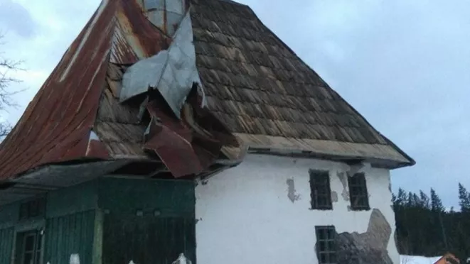 Vjetar je skinuo i pocinčani lim sa drvene džamije u Tuholju kod Kladanja. Ta džamija je sagrađena u 18. stoljeću i sva je od drveta.