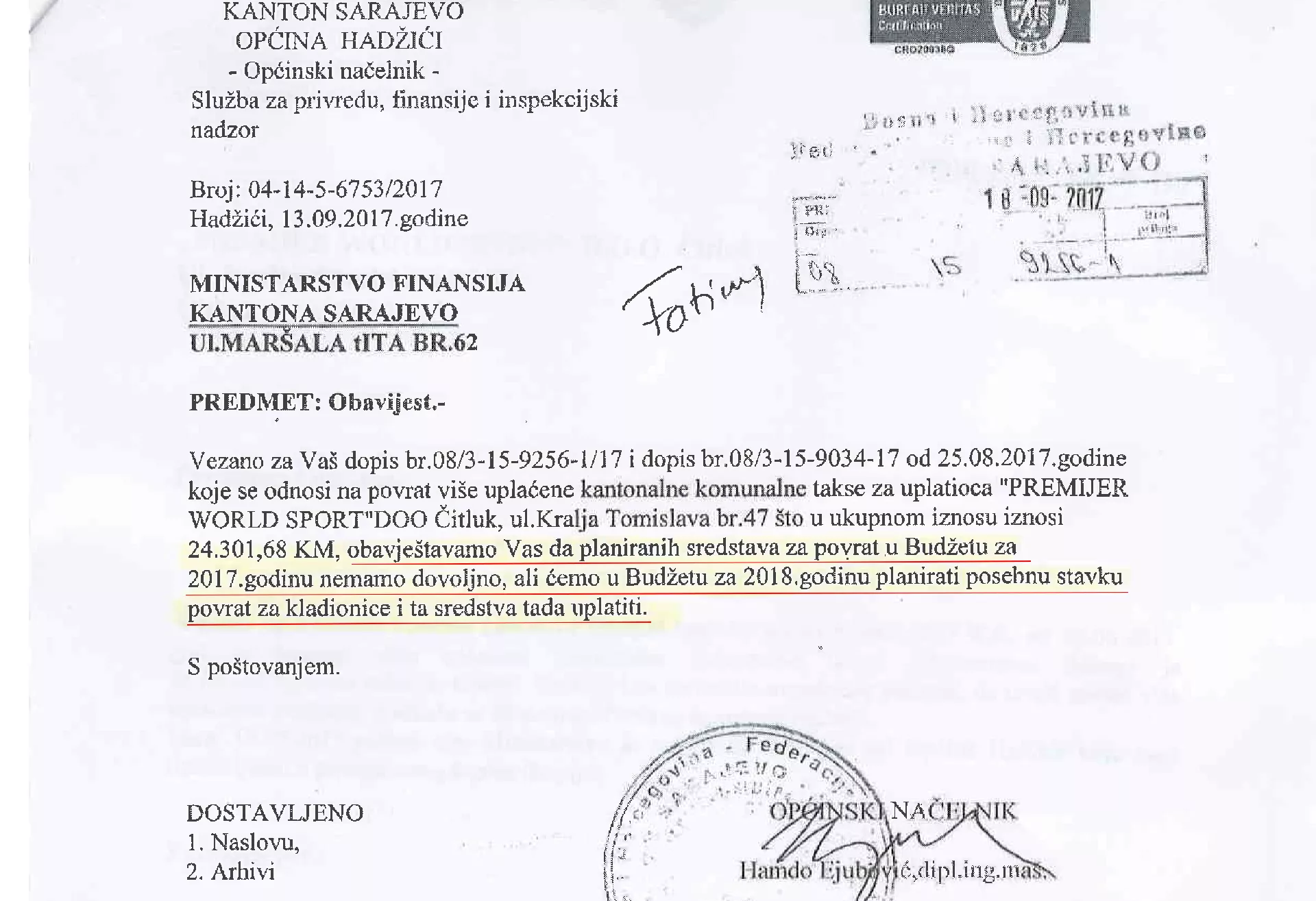 „Obavještavamo vas da planiranih sredstava za povrat u Budžetu za 2017. godinu nemamo dovoljno, ali ćemo u Budžetu za 2018. godinu planirati posebnu stavku povrat za kladionice i ta sredstva tada uplatiti“, stoji u obavijesti koju je potpisao načelnik Općine Hadžići, Hamdo Ejubović.
