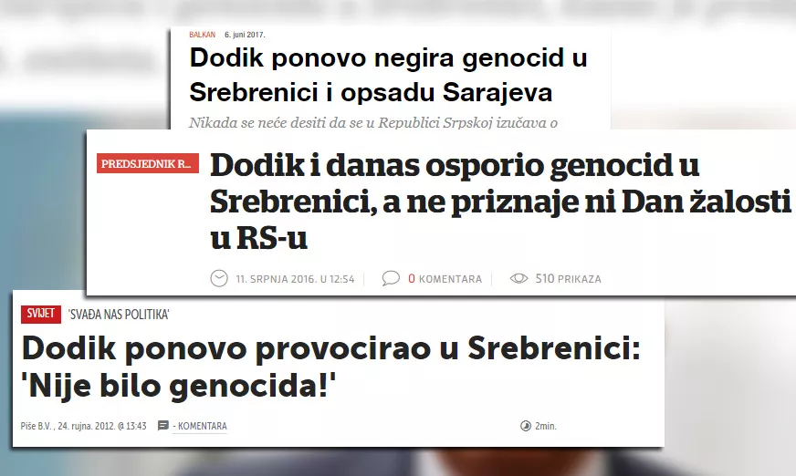 Dodik u svojim medijskim istupima često negira genocid nad Bošnjacima u Srebrenici počinjen 1995. godine, unatoč presudi Međunarodnog suda u Hagu.