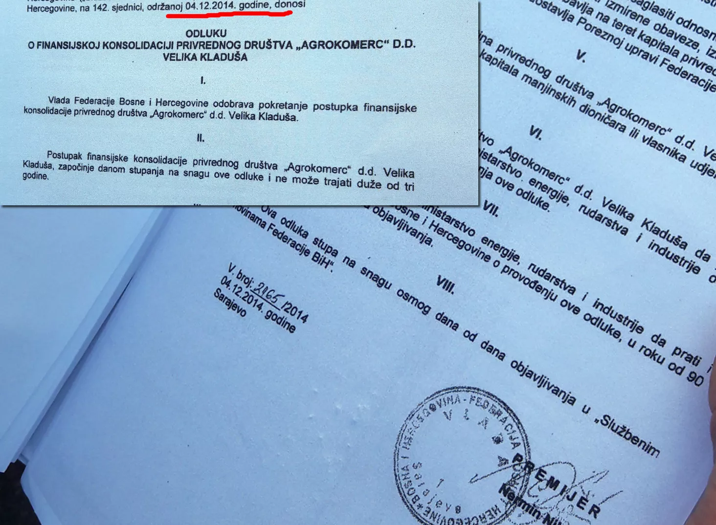 Dokumenti, koji su pokazani na uvid redakciji, jasno ukazuju na to da je protivzakonit predstečajni postupak Agrokomerca, pokrenut u septembru ove godine. Kompanija je u vrijeme pokretanja predstečajnog postupka još uvijek bila obuhvaćena Zakonom o finansijskoj konsolidaciji privrednih društava FBiH, pa je svaka priča o predstečaju u Agrokomercu izravno kršenje ovog zakona.