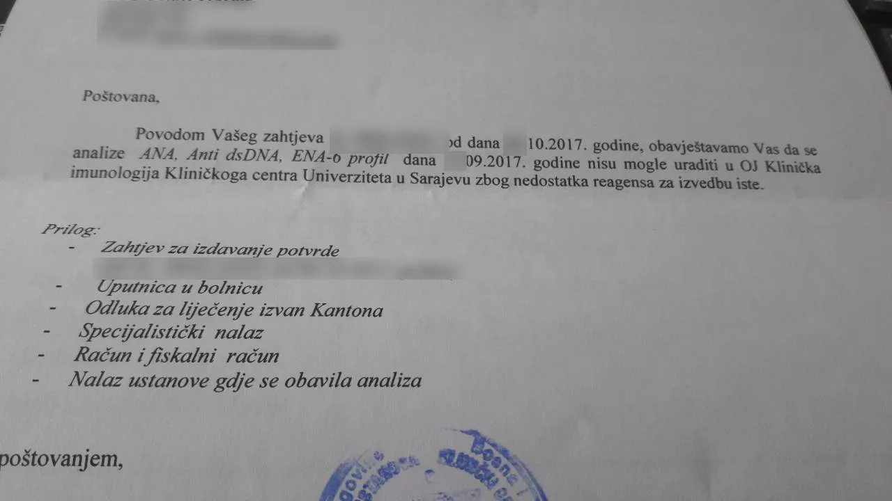 Pacijentica je dobila pisanu obavijest da analize ANA, Anti dsDNA, ENA-6 profil nisu mogli uraditi u OJ Llinička imunologija KCUS-a zbog nedostataka reagensa. Radi se o testovima za autoimune bolesti.