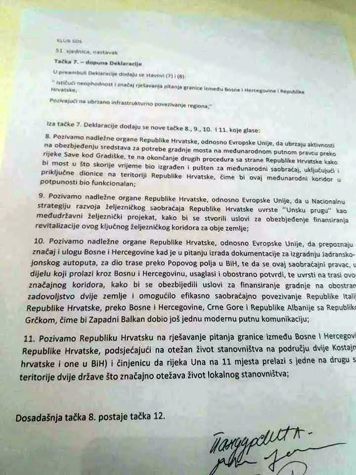 Klub SDS-a dao je svoj prijedlog dopune Deklaracije sa četiri nove tačke. Između ostalog traže da se ubrzaju aktivnosti Hrvatske i EU na obezbjeđenju sredstava za potrebe gradnje mosta na međunarodnom putnom pravcu preko rijeke Save kod Gradiške kako bi što prije bio izgrađen i pušten u međunarodni saobraćaj.
