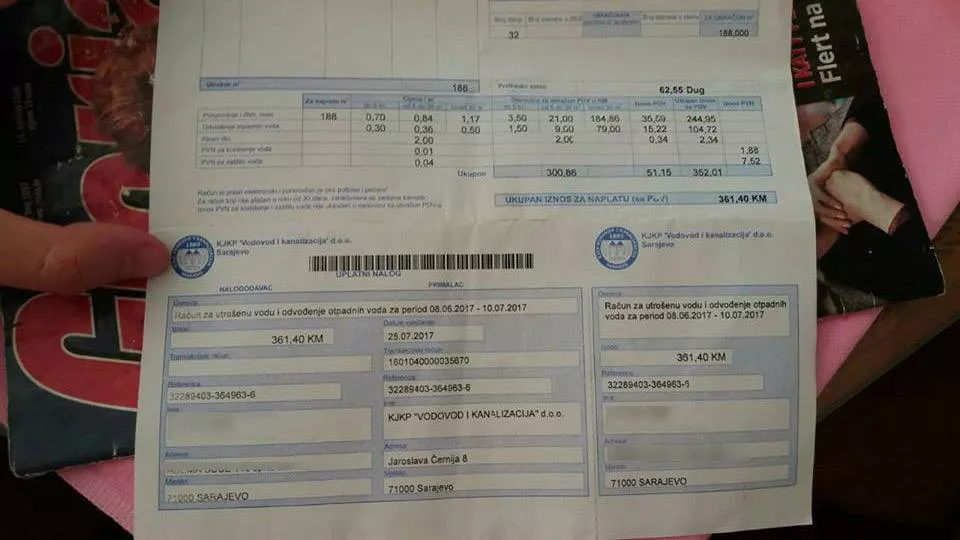 No, nije samo redukcija i nestašica vode ono što u posljednje vrijeme zabrinjava Sarajku Sabinu Kljuno. Ona se posljednjih dana s Vodovodom i kanalizacijom (VIK) ubjeđuje da za mjesec dana nije mogla potrošiti 187 kubika vode, a za šta joj je ispostavljen račun od vrtoglavih 361,40 KM!?