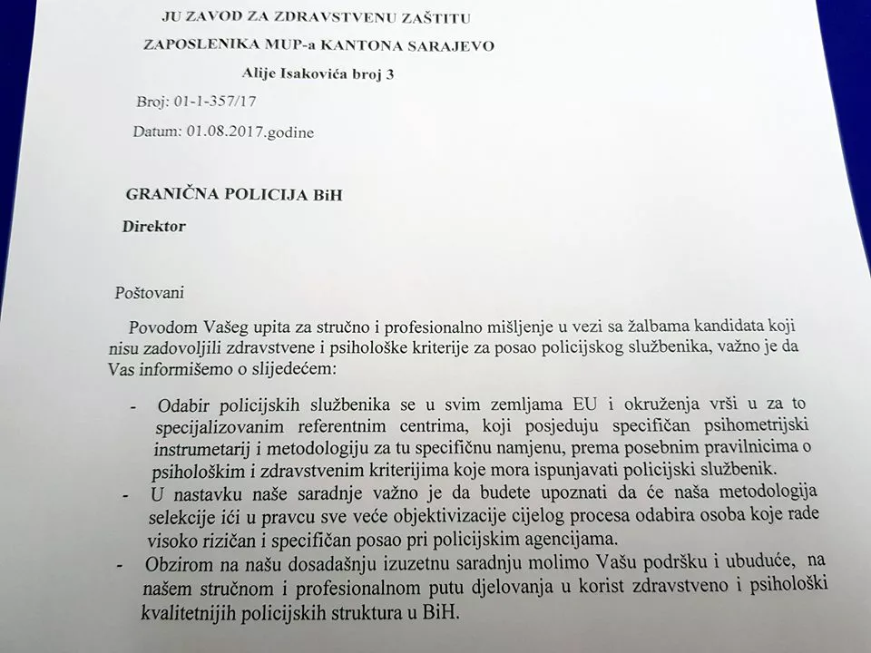 Menadžment Granične policije BiH pisao je Zavodu za zdravstvenu zaštitu zaposlenika MUP KS tražeći mišljenje o žalbama kandidata koji nisu zadovoljili zdravstvene i psihološke kriterije za posao policijskog službenika. Iz Zavoda su direktoru GP BiH Zoranu Galiću odgovorili da se odabir policijskih službenika u svim zemljama EU i okruženja vrši u referentnim centrima koji posjeduju specifičan psihometrijski instrumentarij i metodologiju za tu specifičnu namjenu.
