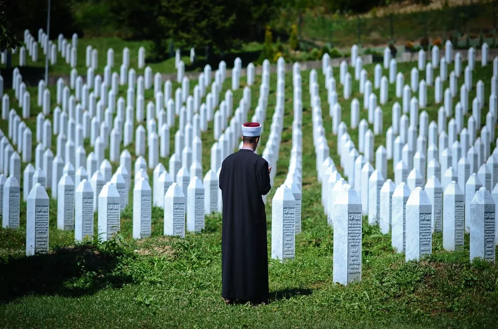 Na fotografiji iz Potočara koju je snimio fotograf Anadolu Agency vidi se imam koji stoji ispred Memorijalnog centra u kojem će 11. jula biti ukopani posmrtni ostaci 71 osobe, koje su srpski vojnici ubili tokom genocida prije 22 godine, prenosi agencija Patria.