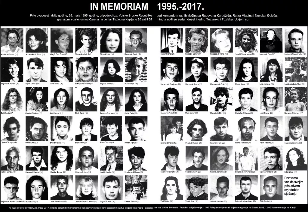 Granata je ubila 71 građanina Tuzle, a ranila ih 150. Prosjek godina ubijenih bio je 23, a najmlađa žrtva imala je samo dvije godine.