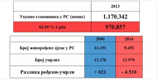 PDP je na konferenciji u Banja Luci u nedjelju prikazao podatke iz kojih se vidi da je u entitetu RS 2000. godine rođeno 14.191, a u 2016. svega 9.452 dijeteta, dakle 4.739 djece manje nego prije 16 godina. Istovremeno, u 2000. je umrlo 13.370 osoba, dok ih je prošle godine umrlo 13.970.