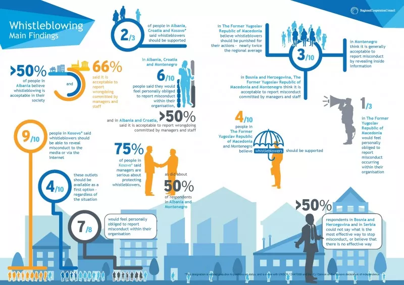 U izvještaju se po prvi put istražuje način na koji građani Jugoistočne Evrope gledaju na uzbunjivače i praksu uzbunjivanja. Analiza zasnovana na uporedivim podacima je rezultat istraživanja 7.000 ljudi iz sedam ekonomija Jugoistočne Evrope.