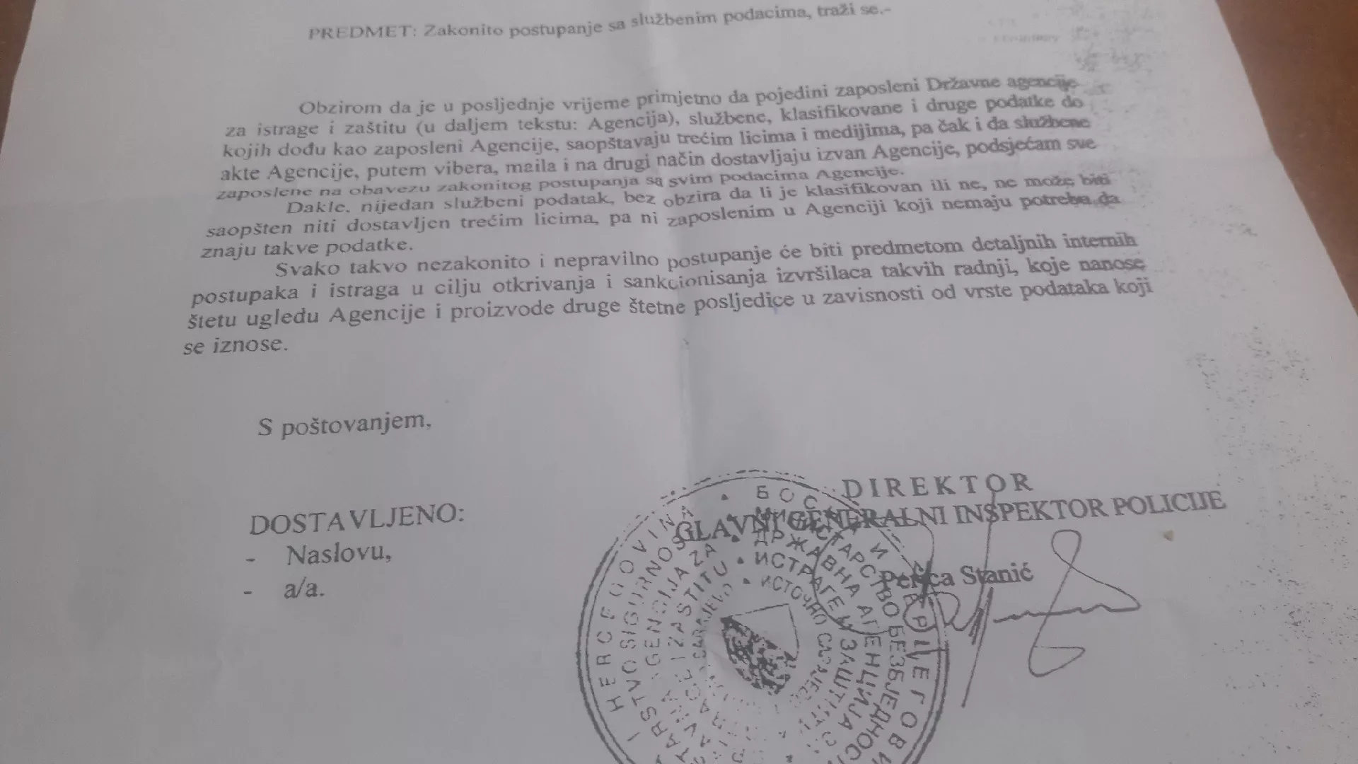 - Nijedan službeni podatak bez obzira da li je klasifikovan ili ne, ne može biti saopšten niti dostavljen trećim licima, pa ni zaposlenim u Agenciji koji nemaju potrebu da znaju takve podatke. Svako tako nezakonito i nepravilno postupanje će biti predmetom detaljnih internih postupaka i istraga u cilju otkrivanja i sankcionisanja izvršilaca takvih radnji, koje nanose štetu ugledu Agencije i proizvode druge štetne posljedice u zavisnosti od vrste podataka koji iznose – stoji u dopisu.