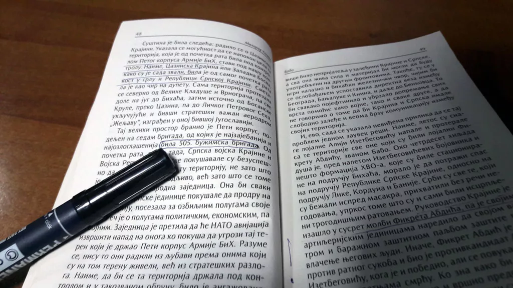 - Sama teritorija protezala se od Velike Kladuše i Vrnograča, pa sve dole na jug do Bihaća. Zatim, istočno od Bosanske Krupe preko Cazina pa da Ličkog Petrovog Sela, uključujući i bivši strateški važan aerodrom Željavu... Taj veliki prostor branio je Peti korpus, podijeljen na sedam brigada, od kojih je najzajebanija i najozloglašenija bila 505. Bužimska brigada – opisuje Ulemek dalje svoje prve dane na ratištu u Bosni i Hercegovini.