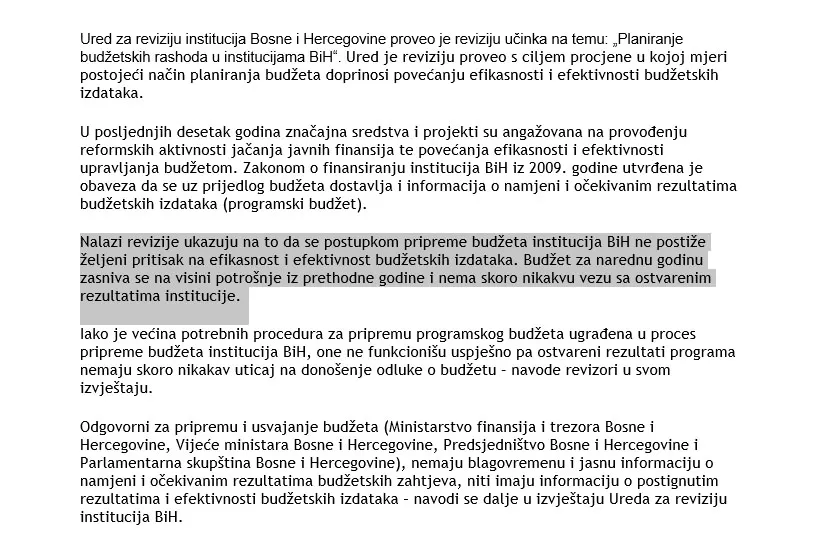 - Odgovorni za pripremu i usvajanje budžeta (Ministarstvo finansija i trezora Bosne i Hercegovine, Vijeće ministara Bosne i Hercegovine, Predsjedništvo Bosne i Hercegovine i Parlamentarna skupština Bosne i Hercegovine), nemaju blagovremenu i jasnu informaciju o namjeni i očekivanim rezultatima budžetskih zahtjeva, niti imaju informaciju o postignutim rezultatima i efektivnosti budžetskih izdataka – navodi se dalje u izvještaju Ureda za reviziju institucija BiH.
