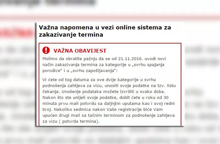 Obzirom na trenutnu veliku potražnju za terminima, molimo da obratite pažnju na to da period čekanja između registracije i potvrde termina može trajati i nekoliko sedmica. Iz tog razloga molimo da se u tom periodu ne raspitujete o statusu vaše registracije odnosno termina.