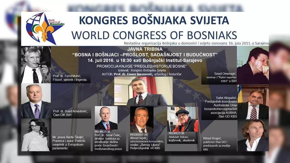 U Bošnjačkom institutu u Sarajevu, 14. jula sa početkom u 18:30 sati, u organizaciji Kongresa Bošnjaka Svijeta (KBS) održat će se javna tribina „Bosna i Bošnjaci – prošlost, sadašnjost i budućnost“.