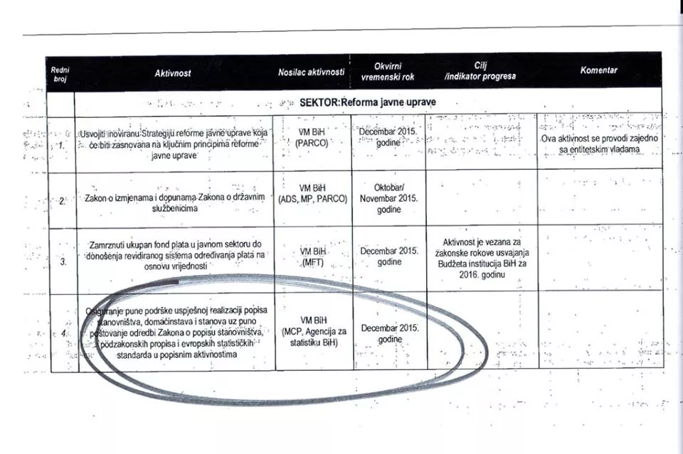 Iako državni premijer Denis Zvizdić često ističe da se reformska agenda uspješno realizira još uvijek je nejasno kako se može nazvati uspješnom kada i u akcionom planu kojeg je sačinilo Vijeće ministara stoji da se trebala osigurati puna podrška uspješnoj realizaciji popisa stanovništva i stanova uz puno poštovanje Odredbi Zakona o popisu stanovništva, podzakonskih propisa i evropskih statističkih standarda u popisnim aktivnostima.