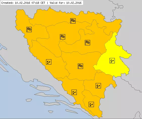 Izdato je i narandžasto upozorenje za Banja Luku, Foču, Mostar, BIhać, Prijedor, Sarajevo, Trebinje, Tuzlu i Višegrad zbog uara olujnih vjetrova i kiše.