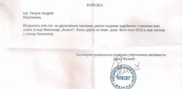 Naime, kako BN televizija saznaje razlog je komentar koji je Andrićeva ostavila na društvenoj mreži Facebook a koji, kako stoji u naredbi "šteti ugledu Kompanije `Boksit`", čiji je direktor Rajko Dukić.