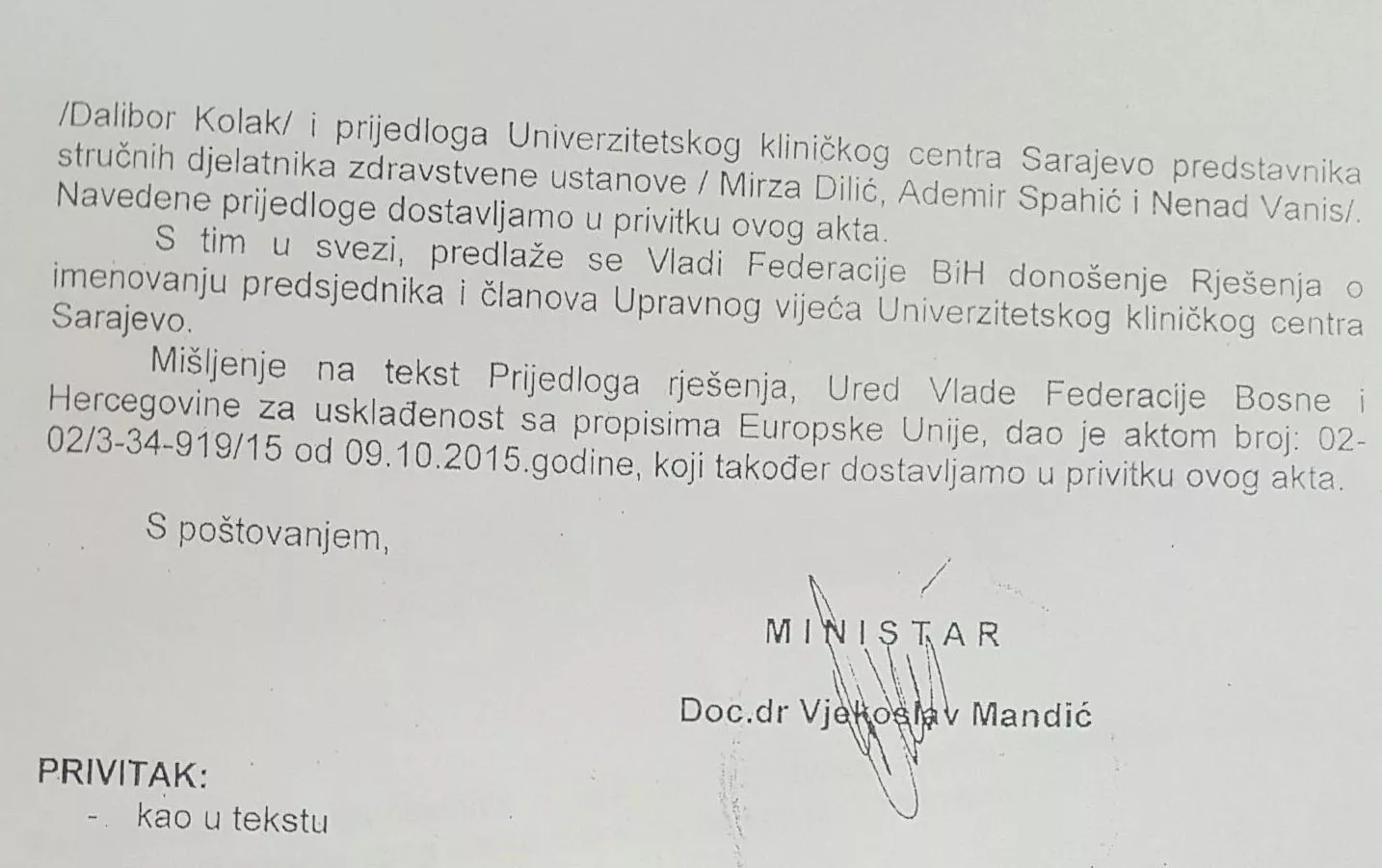 Ovu rang listu potpisao je i ministar zdravstva Vjekoslav Mandić (HDZ BiH) još 9. oktobra te je i uputio na Vladu FBiH koja je trebala potvrditi imenovanje gore predloženih ljudi. No, da bahatost onih koji sjede u Vladi FBiH nema kraja dokaz je da su odmah po čitanju liste izgovorili „ovako se nismo dogovorili“, te su suprotno Zakonu o zdravstvenoj zaštiti imenovali podobne ljude koji nisu bili na listi niti su prošli konkursnu proceduru.