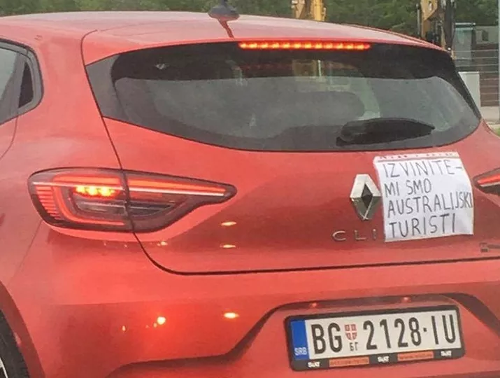Automobil ima beogradske registracije, a na zadnjem dijelu zalijepljena je poruka na kojoj piše: ''Izvinite - mi smo australijski turisti''.