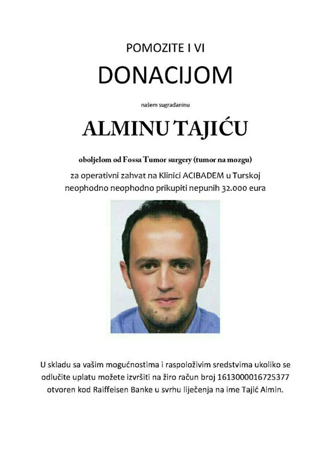 -Nakon niza neuspjelih pokušaja uspostavljanja dijagnoze na UKC Sarajevo svojim novcem platio sam liječenje u Turskoj, na Klinici ACIBADEM gdje su mi uspostavili dijagnozu tomor na mozgu, uz prijedlog za hitnu operaciju uz predračun od 32. 000 eura.